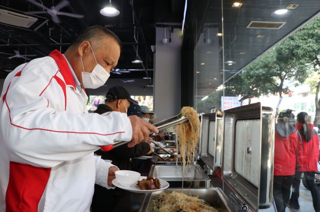 本次活动在源供优选人民食堂自助餐厅(金华店)设主会场,在五邑农家煲仔饭(粤海城店)设分会场。记者在主会场看到,自助餐品区摆放着20多种餐食,肉、菜、汤、主食种类齐全,还有水果、饮料不限量供应。长者在工作人员的指引下,分批有序走进餐品区,自由挑选感兴趣的餐食。