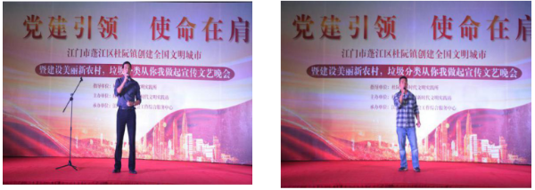 晚会开始,杜阮镇委委员高豪领和南芦村党支部书记苏全球分别为晚会致词。他们鼓励全体村民要积极发动身边人,从小事做起,做好文明卫生,推动垃圾分类。