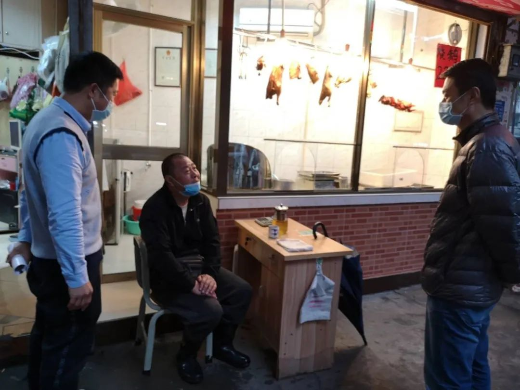 环市街相关负责人走访施某的烧腊店,了解其经营情况。