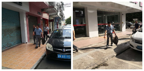 ▲镇督查组工作人员在购物广场和大型超市检查基本标识及消防设施