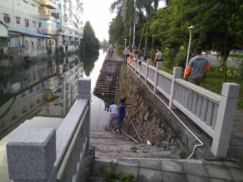 ▲环卫站全体党员、组长对中心河道河岸进行巩固整治