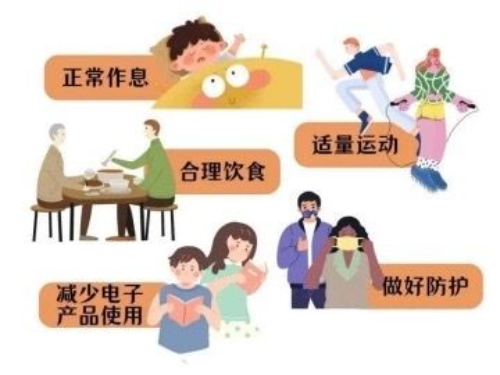 根据老师的提议,提醒孩子坚持每天开展两小时体育锻炼,保障充足睡眠,提高身体免疫力,少用电子产品,指导孩子注意用眼卫生,保护视力,建议养成每天做眼保健操的好习惯。