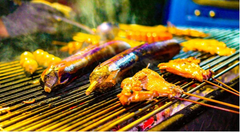 在一家“热火朝天”的烧烤摊位前,尽是排队等候购买的食客。摊主白阿姨一边热情招揽顾客,一边麻利地给烤串刷上酱汁,烧烤摊上肉香四溢的牛肉串、油润香嫩的烤羊排、鲜香劲道的鱿鱼串正在炭火的烘烤下滋滋冒油。