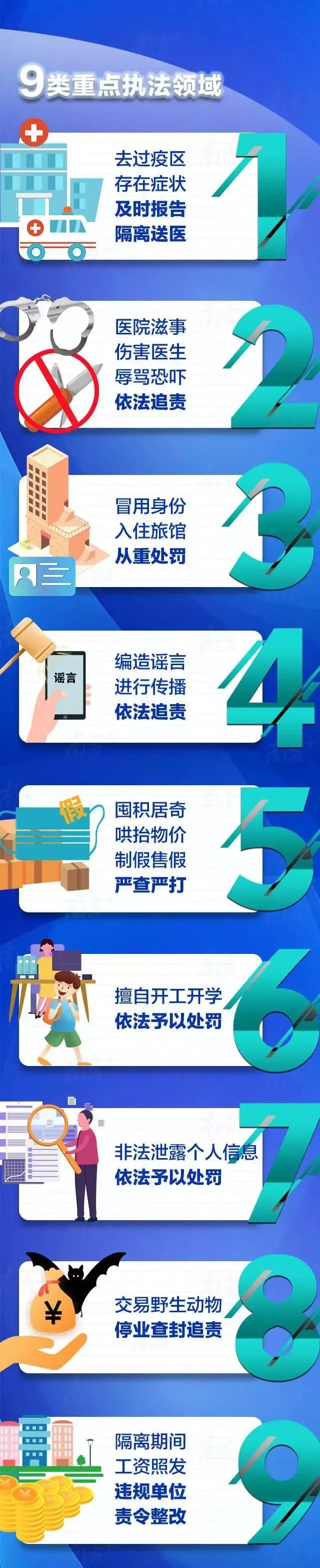 2月4日,省委全面依法治省委员会办公室印发《关于做好新型冠状病毒感染的肺炎疫情防控应急行政执法工作的指导意见》(简称《意见》),明确规定了七类应急执法措施和九类重点执法领域,对瞒报谎报、干扰防控、哄抬物价、传播谣言等行为的执法工作作出要求。