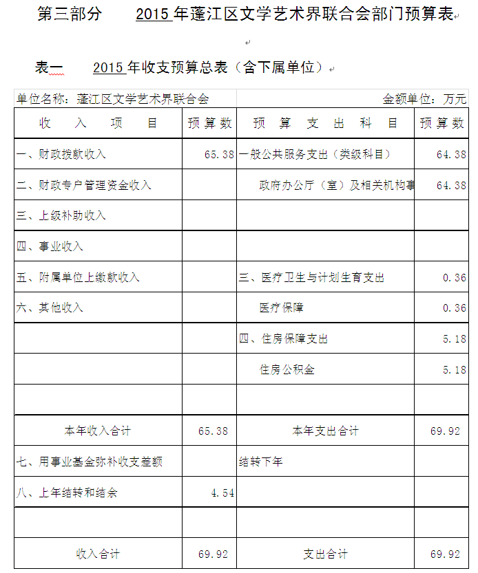 文学艺术界联合会收入预算69.92 万元,其中:公共财政预算收入65.38万元,上年结转和结余4.54万元。