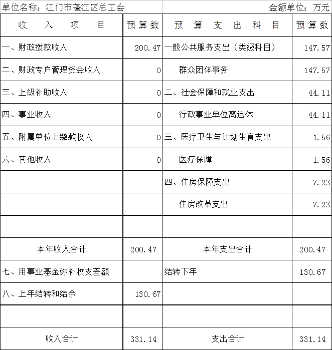 总工会收入预算331.14万元,其中:公共财政预算收入200.47万元,上年结转结余130.67万元,其他收入0万元。