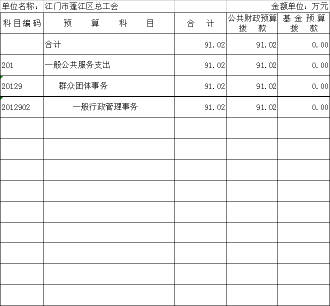 项目支出预算91.02 万元,主要支出项目有困难职工帮扶中心基金5万元、“五一”劳动竞赛活动经费5万元、文体活动经费10万元、工会经费40万元、劳模协会活动经费10万元、劳模荣誉津贴1.02万元、异地务工人员服务中心工作经费20万元。