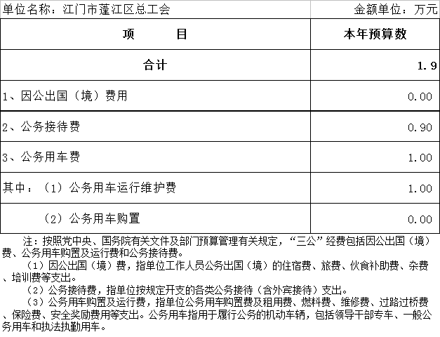 总工会用财政拨款数开支的出国(境)经费、车辆购置及运行费、公务接待费(简称“三公”经费)支出合计1.9 万元。