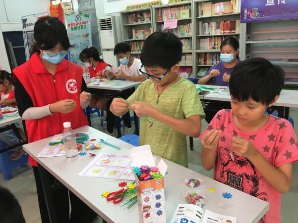随后,志愿者给小朋友们分发了制作材料,并向大家介绍了每样材料的用途和制作纽扣花的步骤。小朋友们迫不及待地挑选自己喜欢的纽扣和花瓣,跟着志愿者一起学习制作。大家把选好的纽扣组成“花蕊”,用铁丝作为“花枝”把纽扣和花瓣串在一起再拧紧做成一朵朵纽扣花。不一会儿,一支支花朵合并成了一把花束。最后把纽扣花束放进装饰好的花瓶里便大功告成。小朋友们兴奋不已,纷纷拿起成品拍照留念。