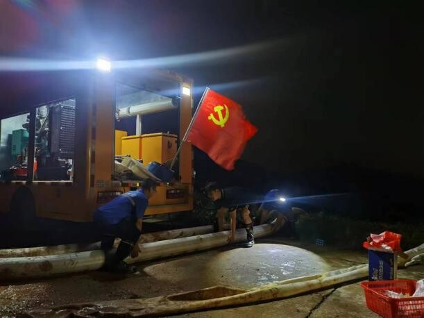 行动中,谭志辉、郑耀辉、梁健锋等党员充分发挥“急先锋”作用,既当指挥员,也做战斗员,做防汛抗洪的“顶梁柱”。他们一组人员迅速铺排水管和下水泵到河里,另外一组人员操作移动排涝车设备。大家相互配合,争分夺秒地加快排水,一直忙碌到晚上8点多也顾不上吃饭。