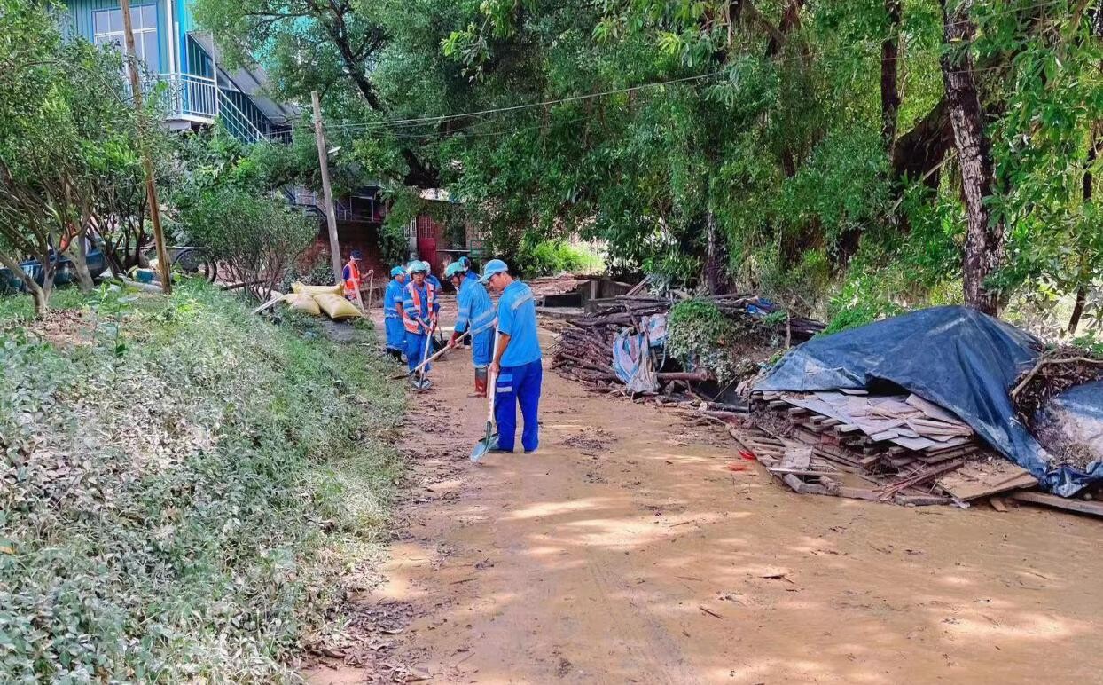 由于暴雨后沉积淤泥较多,环卫工人先将较厚的淤泥铲除清理,再使用高压清洗车进行冲洗,恢复道路畅通和村容村貌洁净。