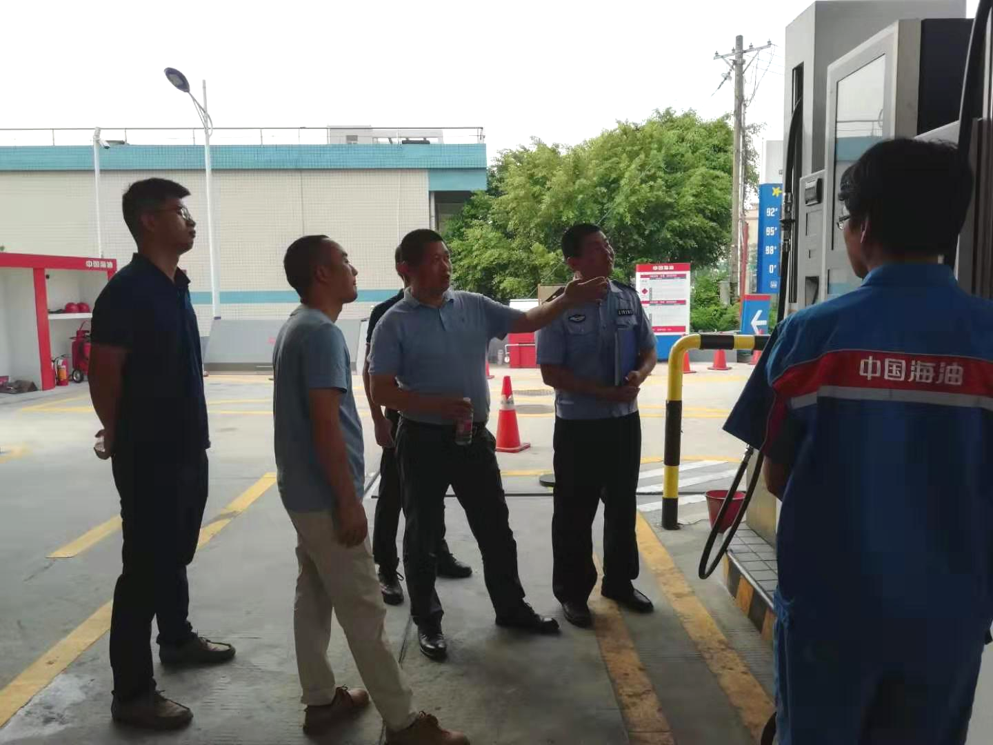 检查组一行仔细深入地检查了成品油相关经营证照、安全生产及反恐工作等三方面的情况。经检查,2家加油站均亮照经营,相关证照在有效期内,加油机定期检测,全部更换完成国VI汽(柴)油标识。卸油口消防应急物资齐全,国庆节期间均编排了应急值班表。中海油荷塘加油站在加油站出入口分别设置了摄像头,进行反恐安全视频监控;配置车辆加油防冲撞设施,符合反恐工作要求,获得了检查组的一致认可。