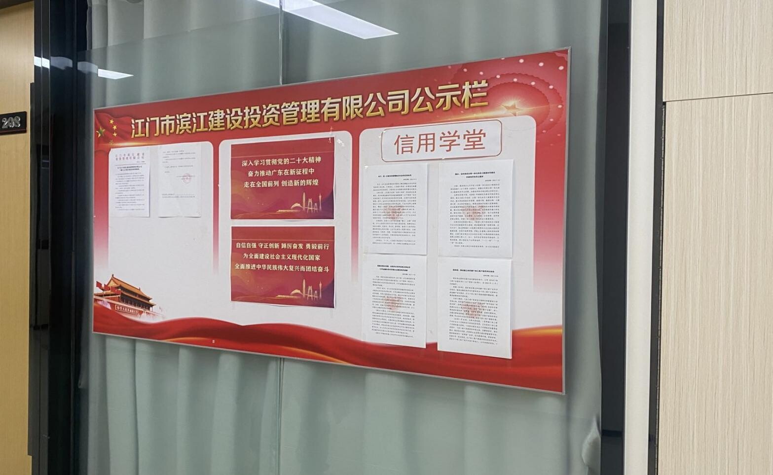 为了让职工能更快了解到国家关于推动诚信文化建设方面的最新信息,滨江管理公司建立信用学堂,通过张贴宣传画报、传阅学习资料、观看宣传教育视频等形式宣传诚信文化。2022年7月开展信用学堂主要学习内容是政府部门出台的有关加快推进全社会信用体系建设的一些政策前沿信息,其中包括国务院办公厅印发的《全国一体化政务大数据体系建设指南》《关于进一步完善政策环境加大力度支持民间投资发展的意见》及《促进个体工商户发展条例》等内容,提高公司员工对建立和完善个体工商户信用评价体系的知识。