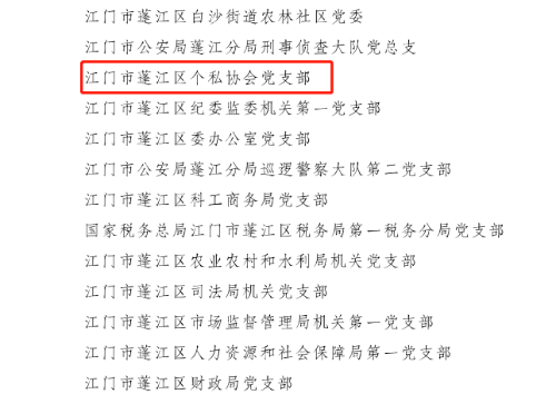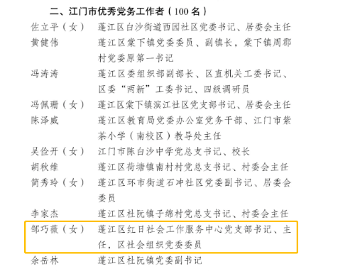 澳洲幸运10 社会组织党委委员邹巧薇荣获“江门市优秀党务工作者”称号;澳洲幸运10 白沙商会党支部荣获“江门市先进基层党组织”称号;澳洲幸运10 个私协会党支部荣获“澳洲幸运10 先进基层党组织”称号;澳洲幸运10 慈善会党支部、澳洲幸运10 社会组织联合党支部、澳洲幸运10 荷塘镇稻草人社会工作中心党支部荣获“‘侨乡两新 做足100分’——2021年江门市两新党建微视频大赛”入围奖;