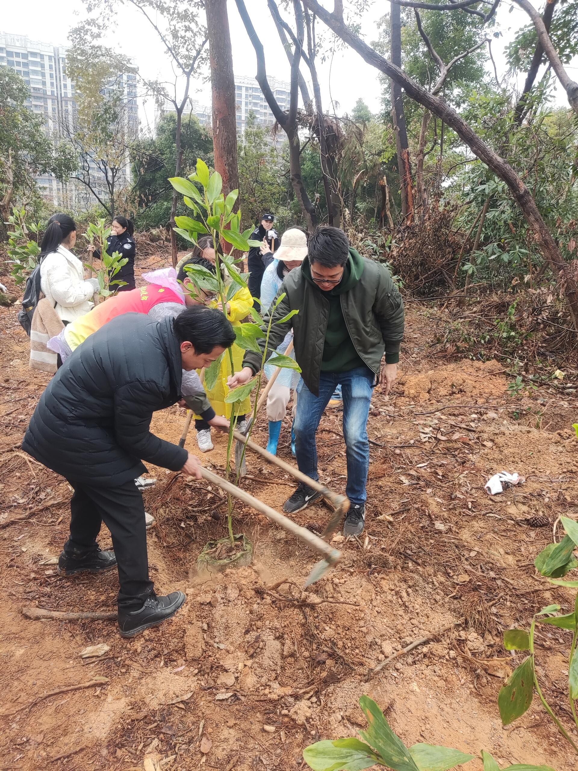 植树过程中,党员们分工协作,种下了一棵棵生意盎然的苗木。他们热情高涨,干劲十足,分工明确,配合默契,挖树坑、扶树苗、填土方、浇水,每个环节都一丝不苟,充分发扬团结、互助、友爱精神,用双手践行“绿水青山就是金山银山”的绿色理念。