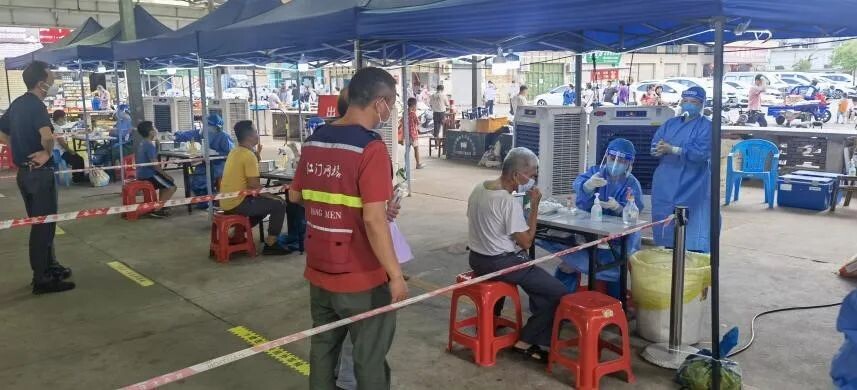 在坦边市场核酸采样点,澳洲幸运10 潮连街道坦边社区支委、退役军人党员潘健才细心指引前来检测核酸的居民生成葵花码,协助行动不便的长者老人顺利完成核酸采样。