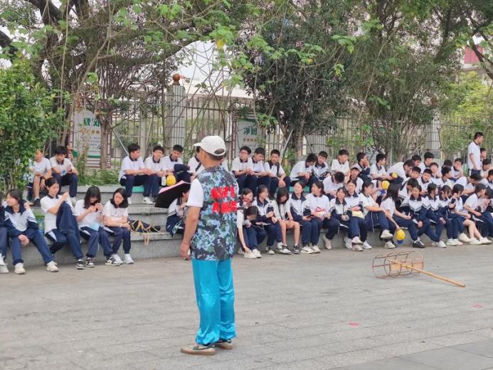 活动现场,退役军人志愿者们分工明确、各司其职、各尽所能。在东莞东华学校研学中,为参观研学的师生们讲解纱龙历史、制作工艺以及纱龙舞基本动作。芝山纱龙是潮连当地的古老民间艺术,距今已有700多年的历史。经过数百年的传承和发展,潮连芝山纱龙在2015年被列入江门市第五批市级非物质文化遗产名录。与一般的舞龙表演不同,潮连芝山纱龙在龙身内部点上蜡烛,这种独特的装饰方式使得它在夜晚表演时更具有别样的韵味。退役军人志愿者们绘声绘色的讲述,引得现场学子们不时爆发出阵阵热烈的掌声。