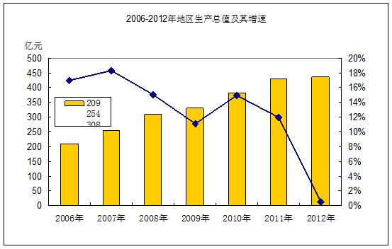 初步核算,2012年全区实现地区生产总值(GDP)438.26亿元,同比增长0.5%。其中,第一产业增加值8.63亿元,下降0.2%;第二产业增加值240.54亿元,同比下降3.3%;第三产业增加值189.09亿元,同比增长6.5%。三次产业结构为1.97:54.88:43.15。在第三产业增加值中,批发和零售业增长1.5%,住宿和餐饮业增长1.7%,金融业增长14.7%,房地产业增长4.7%。人均GDP60518元,增长0.07%。