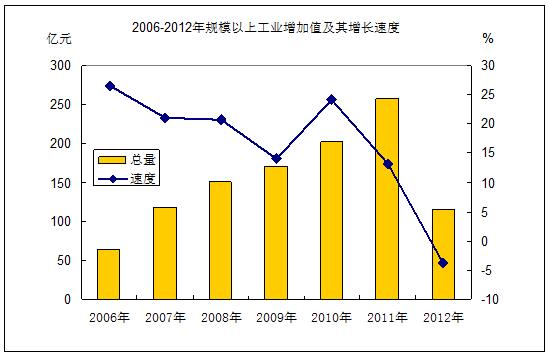 2012年1-12月工业经济效益综合指数174.01%。资产贡献率10.11%,资产负债率51.67%,成本费用利润率5.08%,全员劳动生产率119493元/人,产品销售率100.78%。产品销售收入394.28亿元,下降15.87%;利润总额18.98亿元,下降17.39%。亏损企业151家;亏损企业亏损总额4.44亿元,增长99.32%。