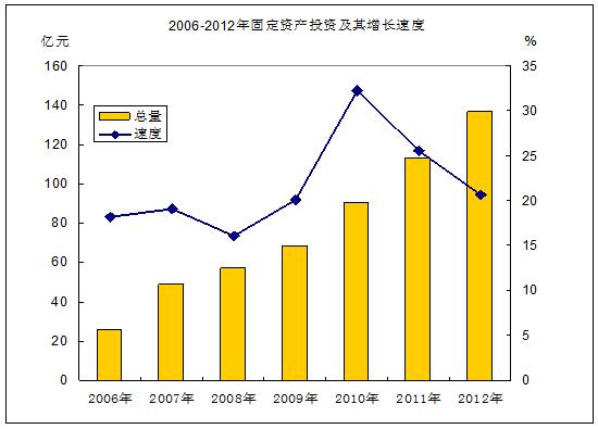 全年固定资产投资 136.33 亿元,比上年增长20.61%。分经济类型看,国有、集体经济投资39.71亿元,增长83.67%;外资经济投资25.03亿元,下降2.34%;民营经济投资71.59亿元,增长8.83%;分产业看,第一产业投资0亿元;第二产业投资38.37亿元,增长9.28%;第三产业投资97.96亿元,增长27.31%。