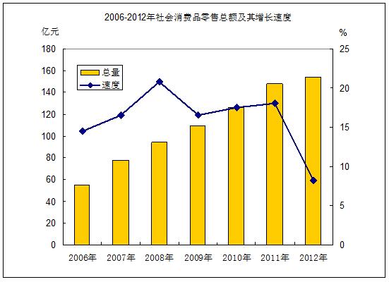 全年社会消费品零售总额154.49亿元,比上年增长8.2 %。分行业看,批发零售业零售额140.82亿元,增长8.38 %;住宿和餐饮业零售额13.67亿元,增长6.4%。分地域看,城镇消费品零售总额137.03亿元,增长10.25%;农村消费品零售总额17.46亿元,下降5.6%。