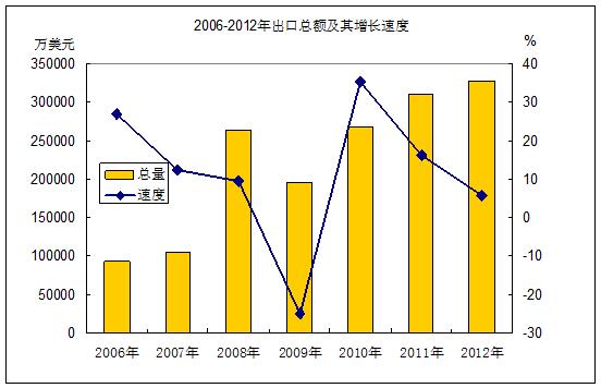 全年进出口总额407729 万美元,比上年增长6.04%,其中,进口总额79721万美元,增长7.73%;出口总额328009万美元,增长5.64 %。出口贸易中,一般贸易出口 279878万美元,增长6.73 %;加工贸易出口48061万美元,增长0.17%。从各种经济类型企业出口情况看,国有企业出口133万美元,下降 80.26%;三资企业出口108038万美元,下降0.78%;私营企业出口219838万美元,增长9.40%。