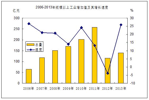 全年规模以上工业企业实现增加值 140.32亿元,比上年增长25.8%,其中,轻工业增加值 75.34亿元,增长34.6%;重工业增加值64.98亿元,增长16.9%。分经济类型看,国有及国有控股企业增长15.6%,股份合作企业增长41.8%,股份制企业增长36.3%,外商及港澳台投资企业增长19.7%,民营企业增长42.9%。