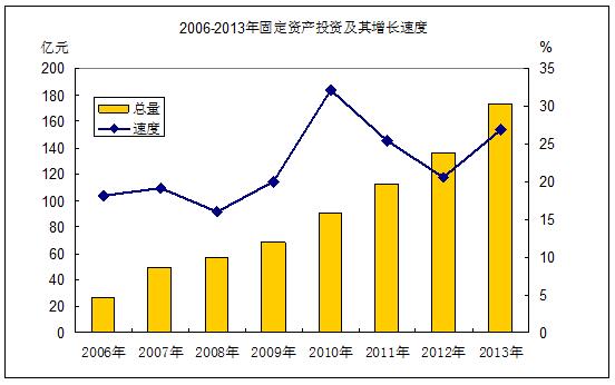 全年固定资产投资 173.01亿元,比上年增长26.91%。分经济类型看,国有、集体经济投资47.87亿元,增长20.55%;外资经济投资17.3亿元,下降30.88%;民营经济投资107.84亿元,增长50.64%;分产业看,第二产业投资26.91亿元,下降29.86%;第三产业投资146.1亿元,增长49.14%。