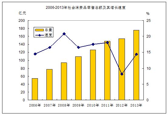 全年社会消费品零售总额175.54亿元,比上年增长14.45%。分行业看,批发零售业零售额160.92亿元,增长15.64%;住宿和餐饮业零售额14.62亿元,增长2.83%。分地域看,城镇消费品零售总额167.27亿元,增长14.55%;农村消费品零售总额8.27亿元,增长12.47 %。