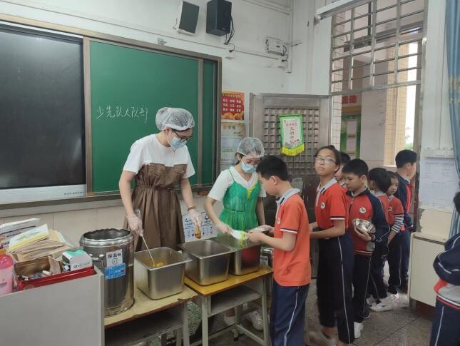 配餐公司用餐桶分装饭菜配送到教室,分餐时学生主动告知老师“吃多少”,由托管老师进行分餐,从根源上杜绝饭菜过剩的浪费行为。分餐后,管餐人员对各班级用餐量进行登记,并把数据反馈给配餐公司,为动态调整食材数量、合理分配各班饭菜数量提供依据,以此完善食材采购和分餐方案。