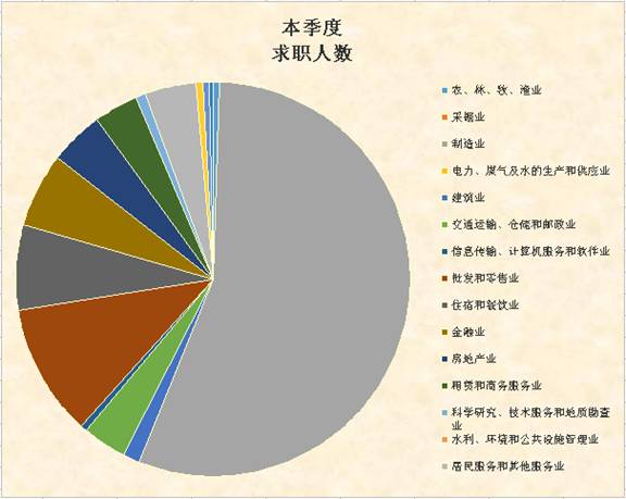 第四季度,我市支柱行业制造业需求人数22868人,占全市各行业总用工需求的64%,环比减少1024人,降幅为4.28%;求职人数为15651人,相比需求人数,求职人数减幅更大,环比减少2573人,降幅达14.12%,凸显年末制造业人力资源市场供应紧张的状况。除了制造业以外,其他行业总的需求人数为13017人,环比减少1252人;求职人数为12564人,环比减少1476人;各行业供求总量均较上季度有所下降,供求占比与上季度的相接近,变动不大。
