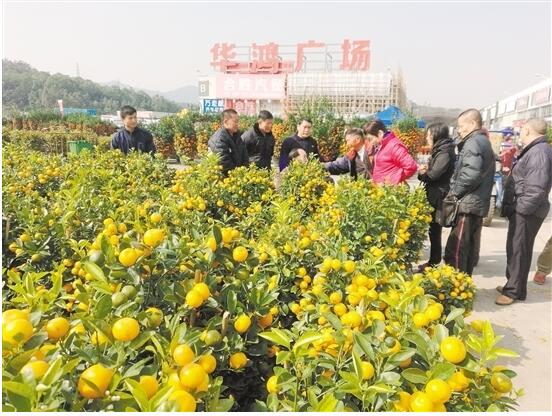 最大的花市华鸿广场花市,记者见到,偌大的广场已经被品种不同的盆桔、花卉所占据。一辆辆满载桔子、花卉的大货车、三轮车来来往往,花农、桔农们正忙着搬运花卉、盆桔,还有不少市民早早地来到广场上,仔细物色自己的目标。