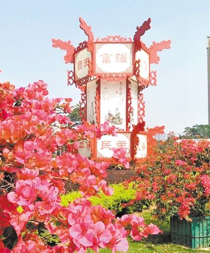 在新之城路口花圃、东湖广场,巨大的东艺宫灯造型公益广告上,社会主义核心价值观被恰到好处地融入宫灯上下12面,中间还绘上“天行健,君子以自强不息”“苟日新,日日新”等格言及山水画,既彰显省非物质文化遗产——东艺宫灯的独特造型,同时也达到了公益宣传、文化宣传的良好效果,可以说是一举多得。