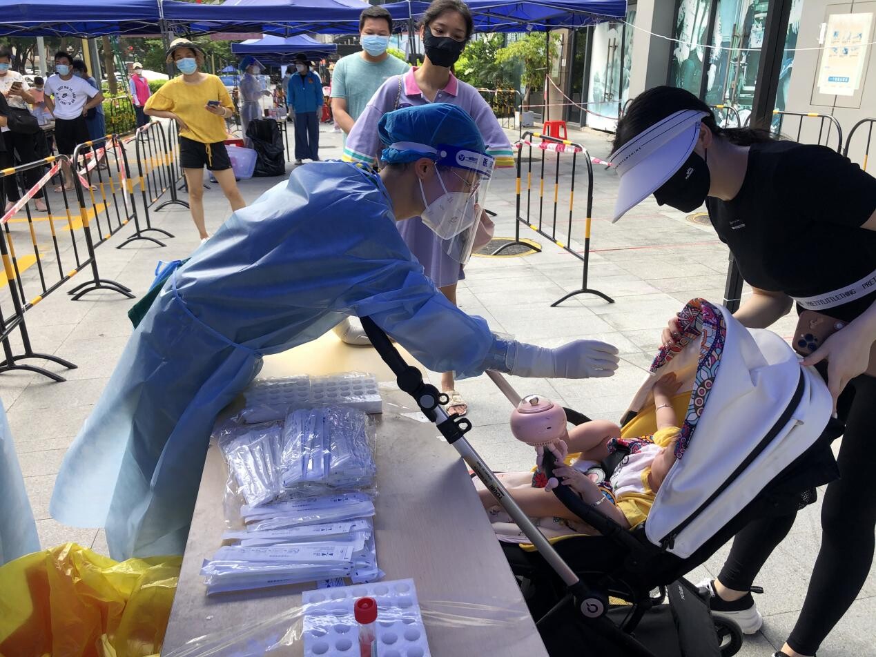 海逸峰璟核酸采样点医务人员耐心为小婴儿进行采样。