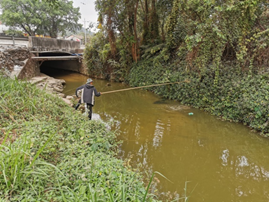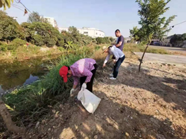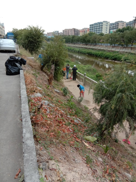 新河社区清理河道两岸的垃圾和杂草。