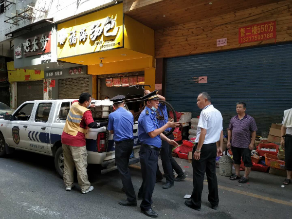 城管杜阮中队联合杜阮交警中队对贯溪市场及周边违反《江门市城市市容和环境卫生管理条例》的流动小贩进行整治。行动中,交警中队依法对违法占用人行道摆卖的小货车进行执法;城管中队依法对违规摆卖的流动小贩执法,暂扣电子秤2把,三轮车2辆。
