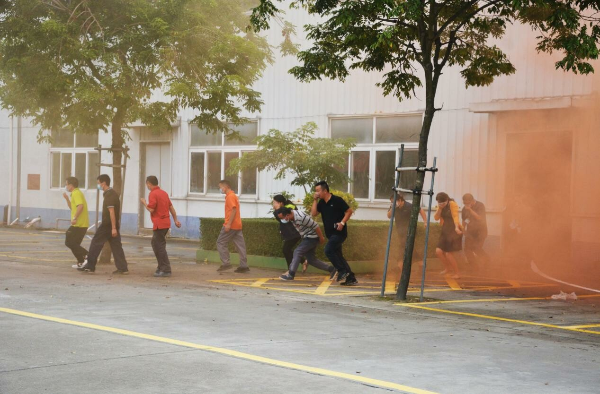 9时30分:“铃铃铃……”杜阮镇汇华创业园尊贵名典家具有限公司有一车间发生火灾冒烟,警报声四起,现场演练正式拉开序幕。该公司属粉尘涉爆企业,可以看到全体员工捂住口鼻,快速有序地撤离现场至安全地带,从拉响警报到撤离不到5分钟时间。