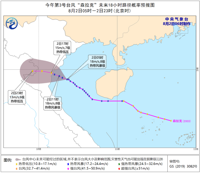 今年第3号台风“森拉克”(热带风暴级)的中心今天(2日)早晨5点钟位于越南清化市东偏南方大约115公里的北部湾海面,就是北纬19.4度、东经106.8度,中心附近最大风力8级(18米/秒),中心最低气压992百帕。