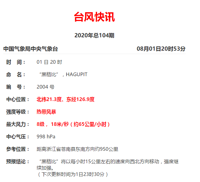 台湾东南洋面热带低压已于昨天(8月1日)晚上加强为今年第4号台风“黑格比”(热带风暴级)(英文名称:Hagupit;名字来源:菲律宾;名字意义:鞭子),晚上8点钟其中心位于浙江苍南东南方约950公里的洋面上,北纬21.3度、东经126.9度, 8级(18米/秒),998百帕。