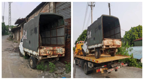 ▲交警中队整治违停并分别到六坊村、康溪村清理拖移“僵尸车”