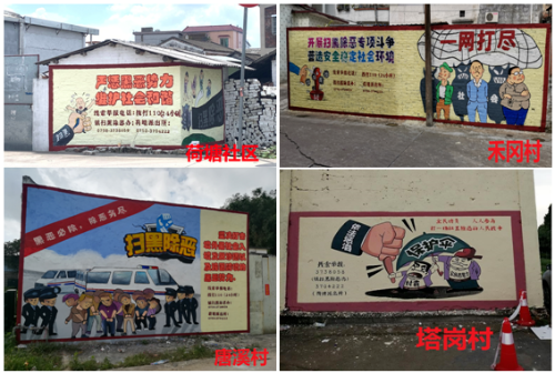 墙绘比普通的纸质画作展示时间更长,将扫黑除恶工作采用通俗易懂的“图案+文字”方式展现在墙壁上,做到让墙会“说话”,通过文化墙推广宣传,借墙接稳地气,既装点了乡道文化环境,又进一步提升了扫黑除恶的文化内涵,让广大群众在潜移默化中得到良好的法制教育。