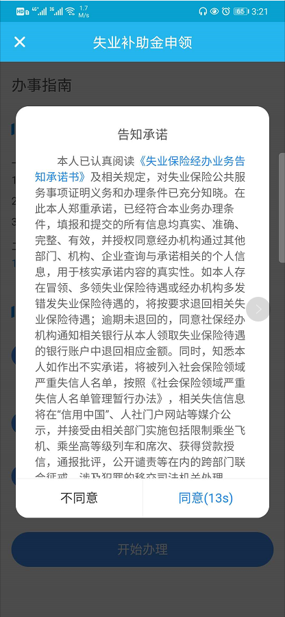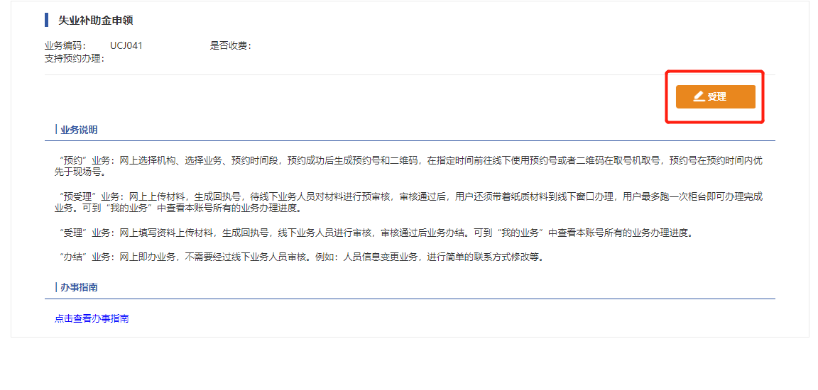 点击【失业补助金申领】,进入失业补助金申领页面, 选择【受理】按钮,校验通过后可填写相关信息并点击【提交】按钮进行网上申报。