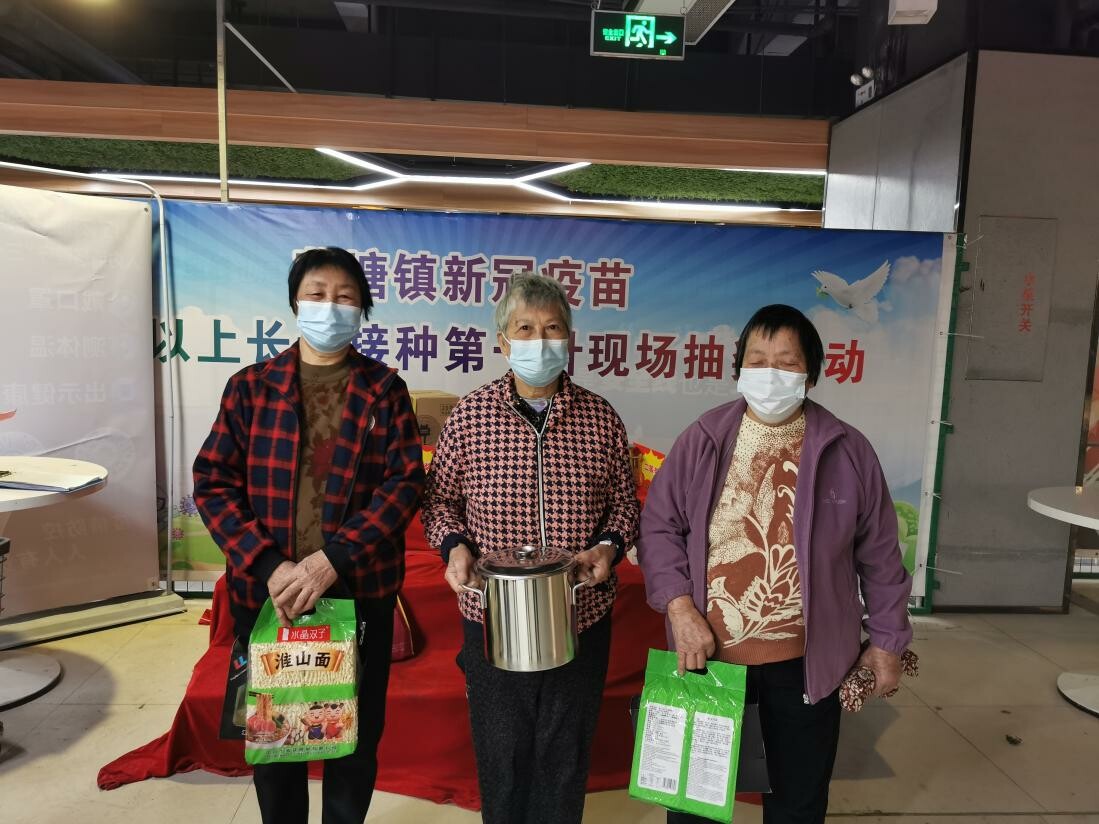 镇经济办发动热心企业捐赠抽奖礼品,完成第一针次接种的长者,即可参与抽奖,奖品包括电动车、落地风扇、不锈钢厨具、百洁布套装、小电灯等生活用品。