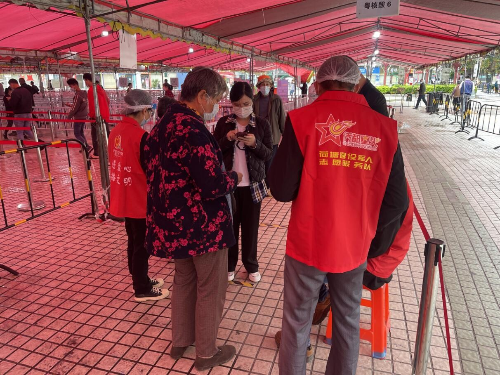 “请戴好口罩,保持好1米距离,打开粤核酸6二维码,确认自己信息已经准确录入”,退役军人志愿服务队来回穿梭于排队人群中,对未在“粤核酸6”录入信息的群众或因没有智能手机而“验码”受阻的老人提供帮助,为怀孕、残障以及高龄老人等提供“绿色通道”快速完成核酸采集。