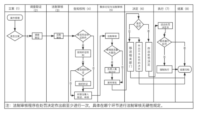 5.集体讨论和法制审核阶段:法规审核组重新对行政执法案件进行复核,并提交分管领导审批;重大案件由法规审核组提交执法委员会进行集体讨论后,决定是否进行行政处罚。(负责机构:法规审核组)