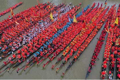 龙舟竞渡前,龙头阵一字排开,