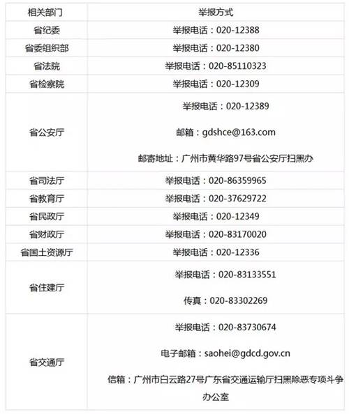 根据中央和省委部署,当前我省正在如火如荼地开展扫黑除恶专项斗争。为充分调动广大人民群众参与扫黑除恶专项斗争的积极性,踊跃举报涉黑涉恶线索,深入推进全省扫黑除恶专项斗争,4月11日省委政法委集中公布相关部门涉黑涉恶线索举报方式。