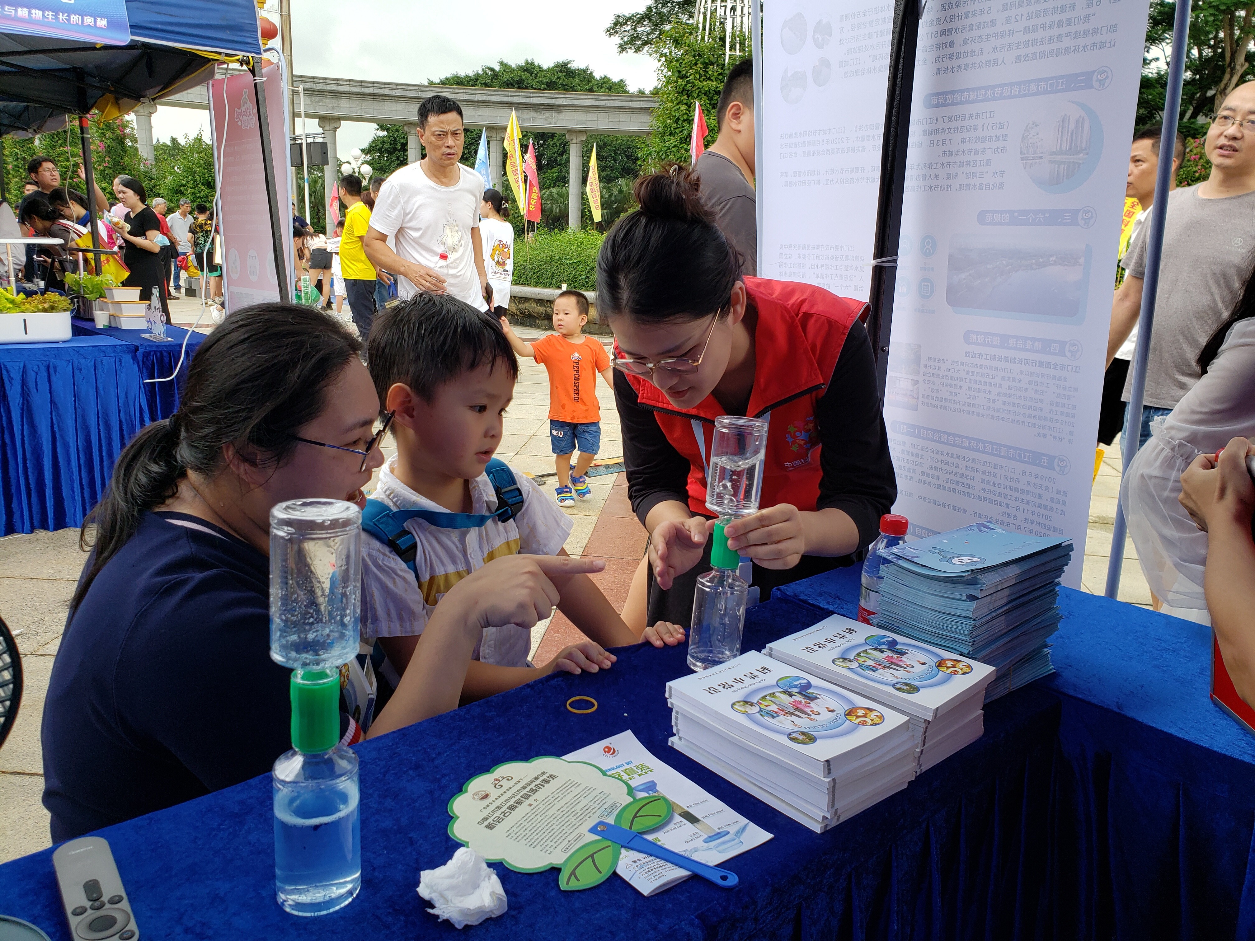 治水科普展位设置了过滤净水柱、水中龙卷风等小实验,供市民和小朋友现场体验。“浑浊的黄泥水经过这样一根小小的柱子就变得澄清了,好神奇啊”,“我们的自来水厂也是这样过滤的吗?”,“水中也会有龙卷风啊?这是魔术吗?”。现场市民和小朋友们发出赞叹并好奇的提问,并细致观察、动手参与小实验。