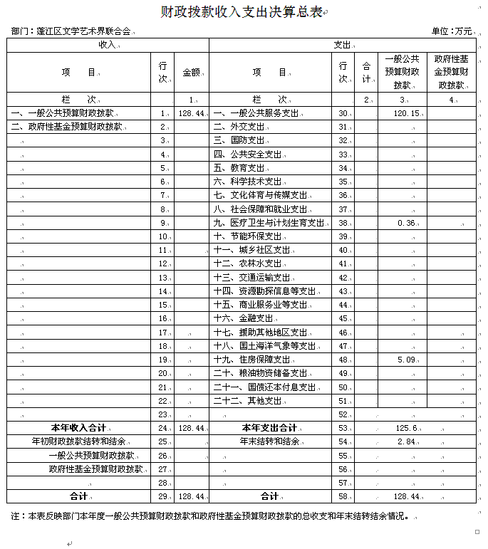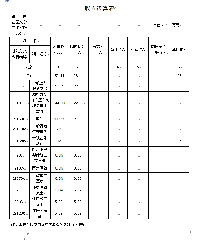 文联收入决算150.69万元,其中:公共财政预算收入128.44 万元,其他收入22万元,上年结转结余0.25万元。