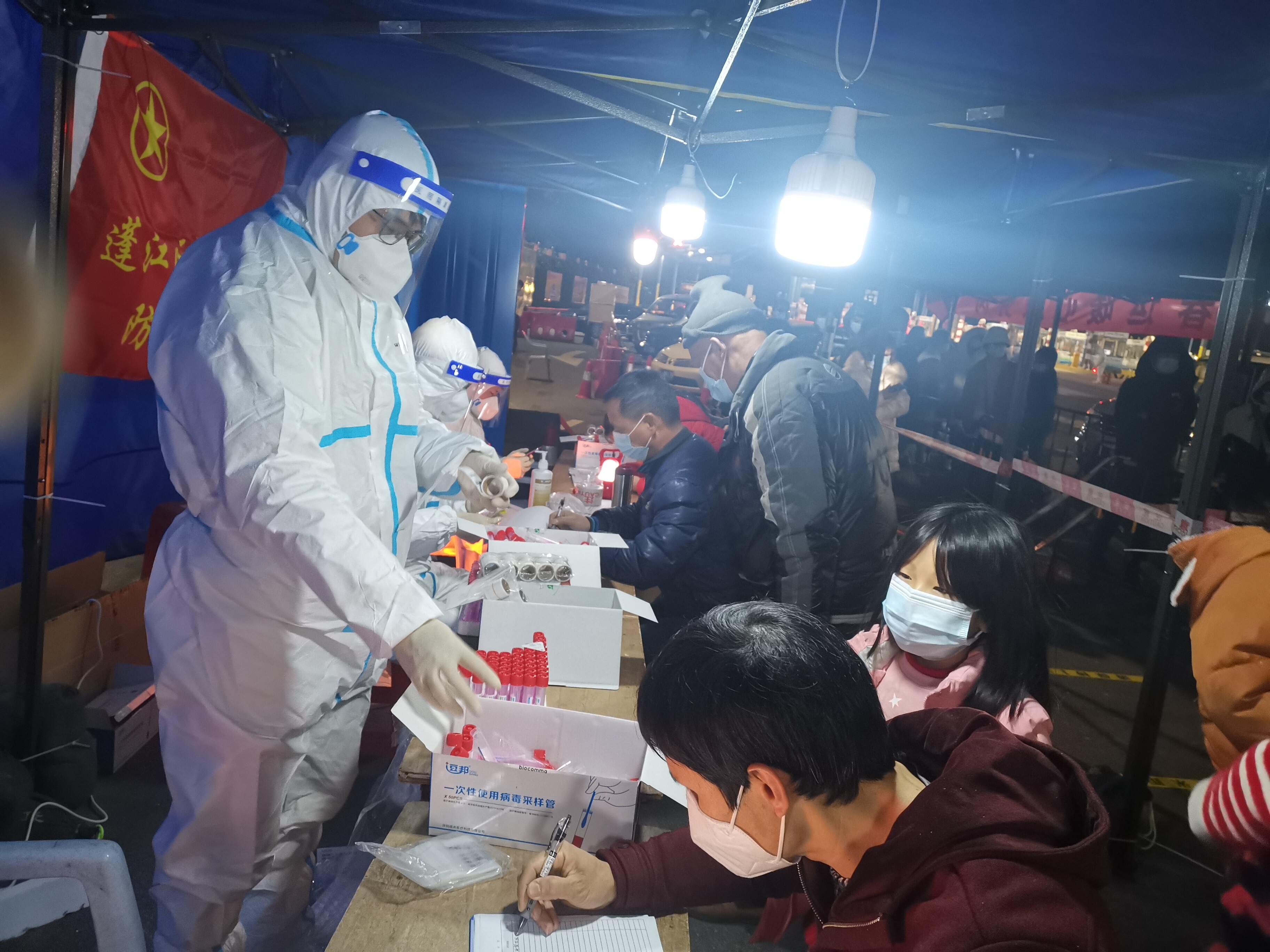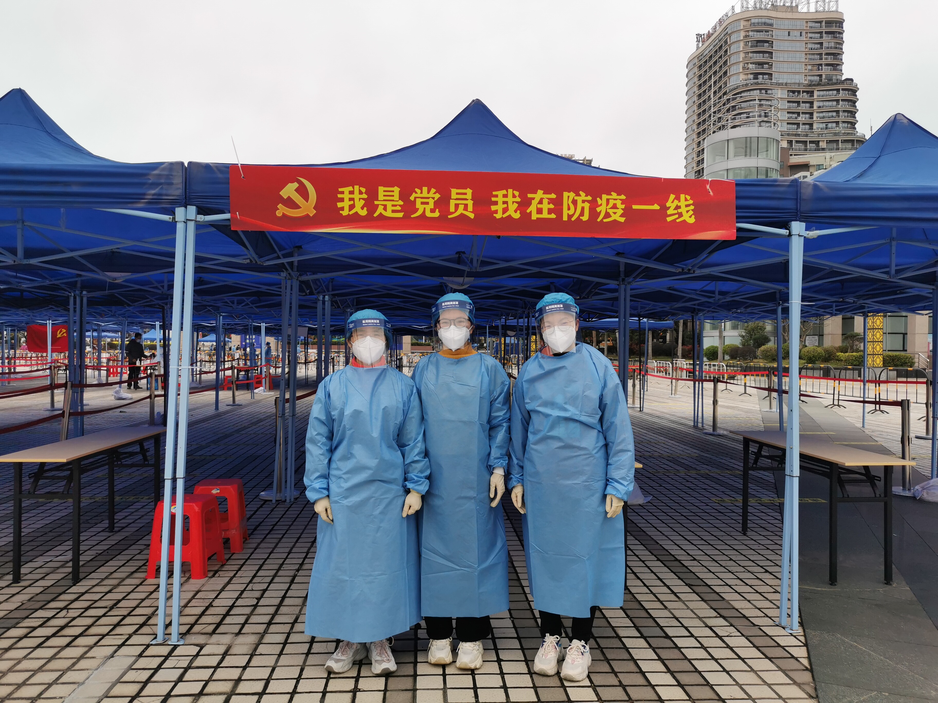核酸采样点现场,党旗迎风飘扬